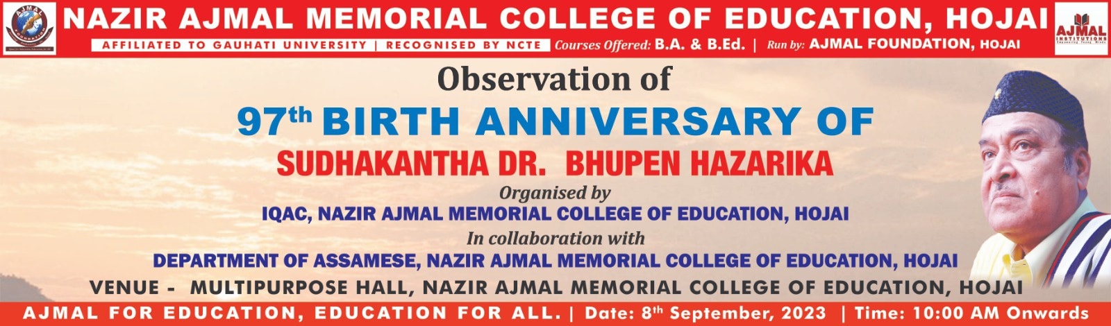 The Literary Club and Cultural Club in collaboration with IQAC, Nazir Ajmal Memorial College of Education organised an event to commemorate the 13th death anniversary of Bharat Ratna Dr. Bhupen Hazarika on 5th November, 2024 from 10:30 am onwards at Nazir Ajmal Memorial Hall.