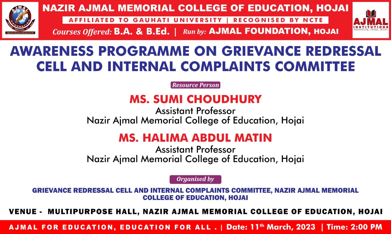An Awareness Program on Grievance Redressal System was organized by the Grievance Redressal Cell in collaboration with the IQAC, Nazir Ajmal Memorial College of Education on 21st October, 2024 from 3 PM onwards at the Seminar Hall. The objective of the event was to educate B.Ed. trainees about the Grievance Redressal System of the college.