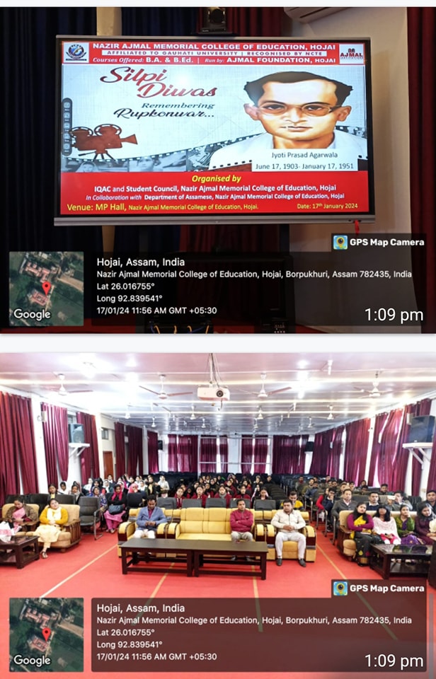 The IQAC of Nazir Ajmal Memorial College of Education, Hojai celebrated Silpi Divas on 17th January, 2025 from 10:30 am onwards to honour the legacy of Jyoti Prasad Agarwala. The event was organised at Ajmal Adarsha Jatiya Vidyalaya, Akashiganga, the adopted school of Nazir Ajmal Memorial College of Education, Hojai.