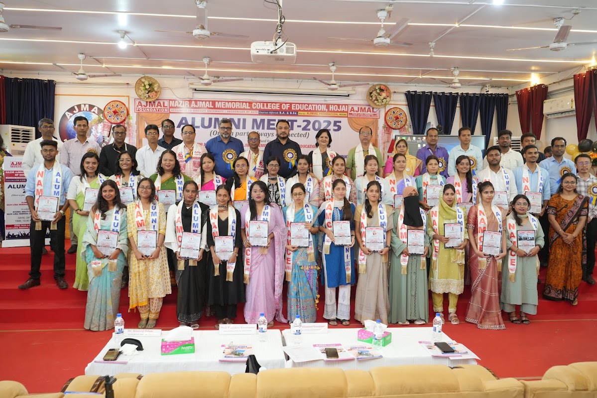 The Alumni Association in collabortaion with IQAC, Nazir Ajmal Memorial College of Education, Hojai organised Alumni Meet - 2025 on 28/07/2025 at Nazir Ajmal Mrmorial Hall. Prof. Dulumoni Goswami, HoD, Dept. Of Education attended the event as Chief Guest and Prof. Gayatree Goswamee, as Guest of Honor, along with Hon'ble Director of Ajmal Foundation, Dr. Khasrul Islam and other dignitaries from Ajmal Foundation attended the event and enlightened the Alumni with valuable words. More than 400 alumni attended the program.